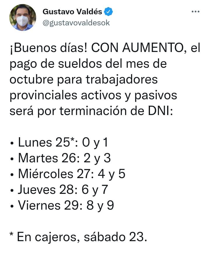 El gobernador Gustavo Valdés comunicó a través de sus redes sociales, el cronograma de pago de sueldos -con aumento- correspondiente al mes de octubre para los trabajadores provinciales activos y pasivos.