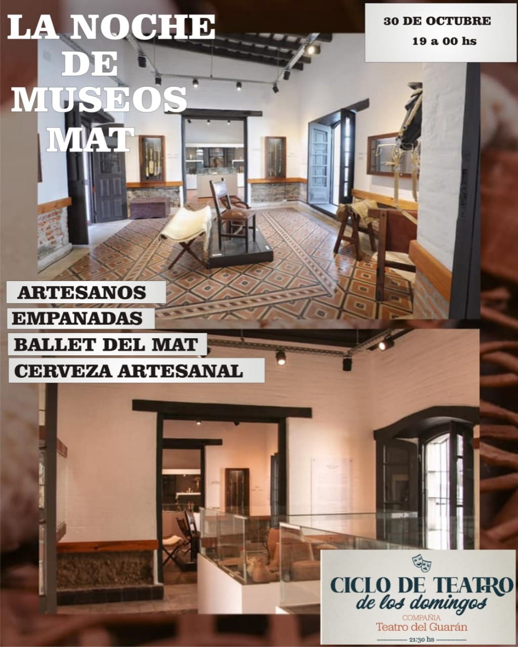 El Museo de Artesanías Tradicionales (MAT) invita a la comunidad a compartir una tarde noche diferente. De 19 hs a 00, los visitantes podrán ver maestros artesanos trabajando y adquirir artesanías, al igual que una presentación de un ballet y una función de teatro. Además será posible disfrutar de cerveza artesanal y comidas típicas. También se montará un stand de libros de autores correntinos coordinado por Casa Azul.