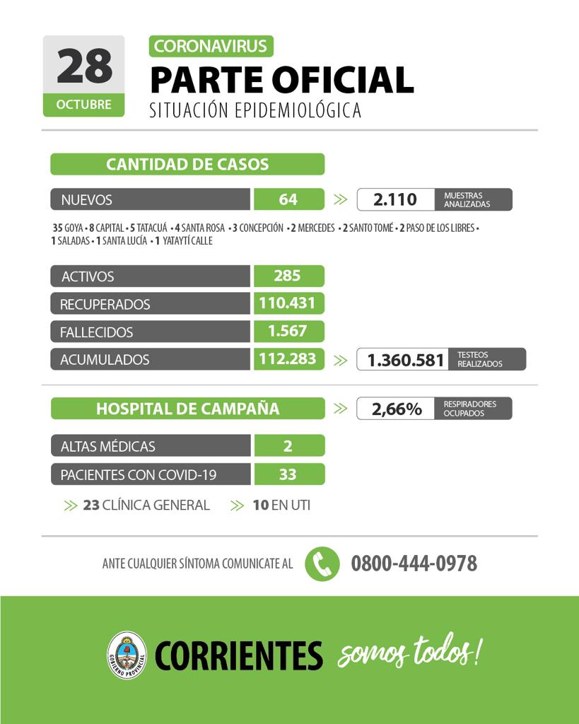 El informe epidemiológico de la provincia de Corrientes registró este jueves 64 nuevos casos positivos de Coronavirus, de los cuales 8 fueron contagios en la ciudad Capital y los 56 restantes en 10 localidades del interior provincial, al haberse analizado 2110 muestras en las últimas 24 horas.