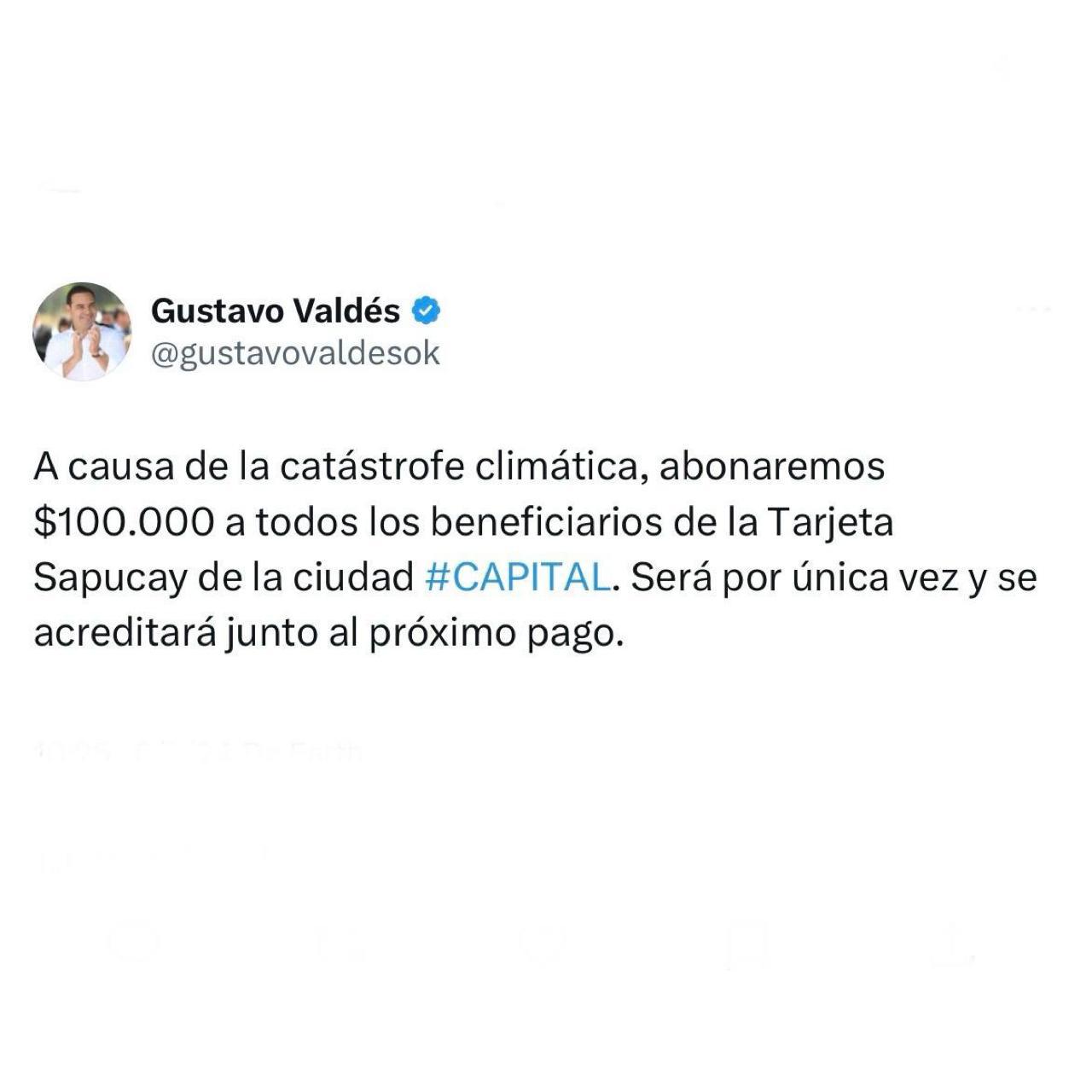 A través de sus redes sociales, el gobernador Gustavo Valdés anunció que, a causa de la catástrofe climática, se abonará $100.000 a todos los beneficiarios de la tarjeta Sapucay de la ciudad de Corrientes. Será por única vez y se acreditará junto al próximo pago.