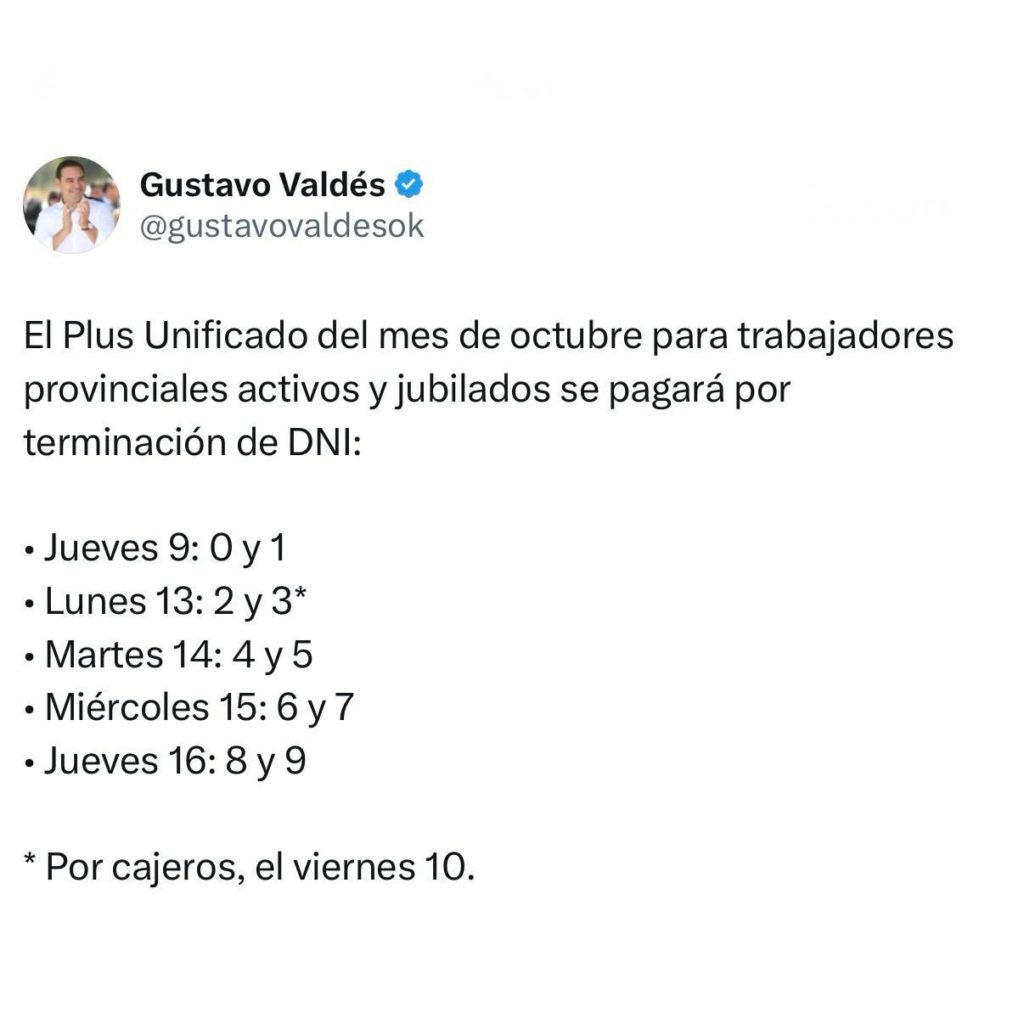 A través de sus redes sociales, @gustavovaldesok, comunicó el pago a los agentes de la administración pública provincial, activos, jubilados y pensionados del Plus Unificado (Adicional Remunerativo Mensual), correspondiente a este mes de octubre, de $110 por beneficiarios.