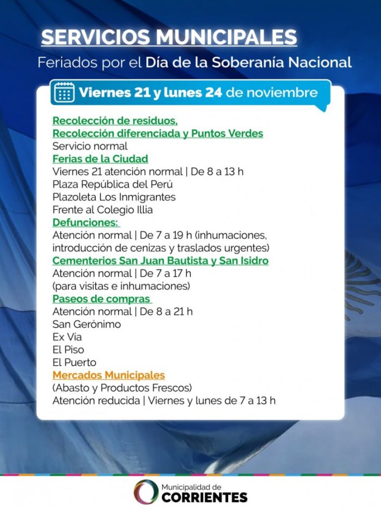 La Municipalidad de Corrientes informa acerca del funcionamiento de los servicios que habitualmente brinda a los vecinos para los próximos viernes 21 y lunes 24 de noviembre, “Día no laborable con fines turísticos” y feriado en conmemoración al Día de la Soberanía Nacional, respectivamente.