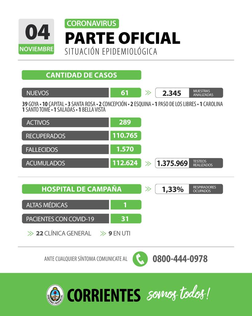 El informe epidemiológico de la provincia de Corrientes registró este jueves 61 nuevos casos positivos de Coronavirus, de los cuales 10 fueron contagios en la ciudad Capital y los 51 restantes en 9 localidades del interior provincial, al haberse analizado 2345 muestras en las últimas 24 horas.