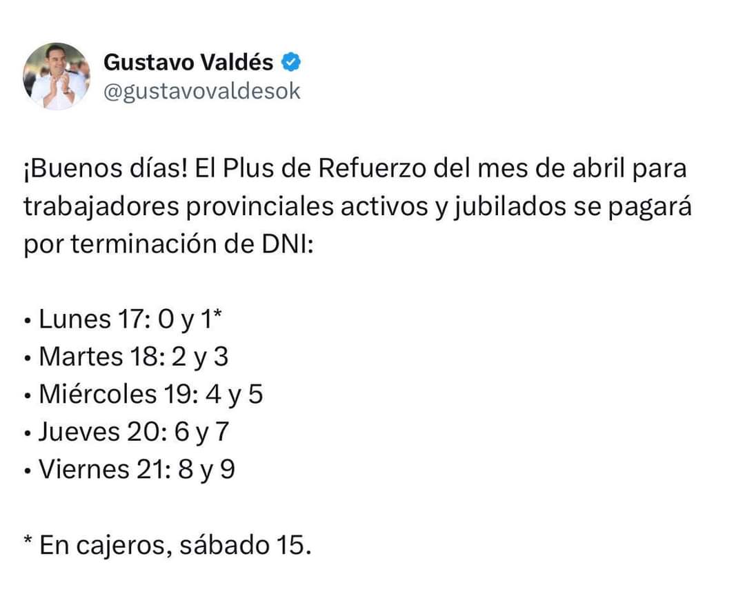 A través de sus redes sociales @gustavovaldesok, el gobernador Gustavo Valdés da a conocer los días en que se abona el adicional remunerativo de abril, de $15 mil por agente. El cronograma se extiende hasta el viernes 21 y alcanza a los activos, jubilados y pensionados correntinos.