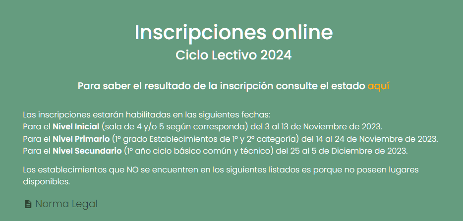 El Ministerio de Educación de la Provincia de Corrientes informa que, en vistas al Ciclo Lectivo 2024, del 3 al 13 de noviembre estarán habilitadas las inscripciones para el nivel inicial (sala de 4 y 5 años), en tanto que para el nivel primario el periodo será del 14 al 24 de ese mes y las inscripciones para el secundario serán del 25 de noviembre hasta el 5 de diciembre.