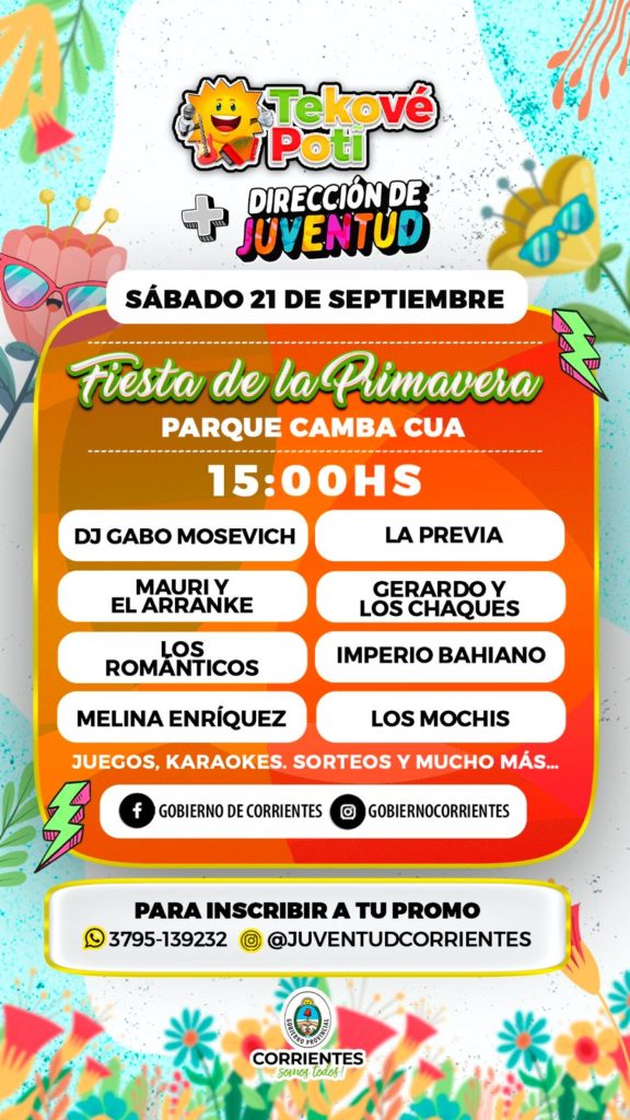 La estación más vibrante del año se celebra este sábado 21 de septiembre. La Fiesta de la Primavera organizada por Tekové Potí, en conjunto con la Dirección de Juventud de la Provincia, tendrá lugar en el Parque Camba Cuá, a partir de las 15.