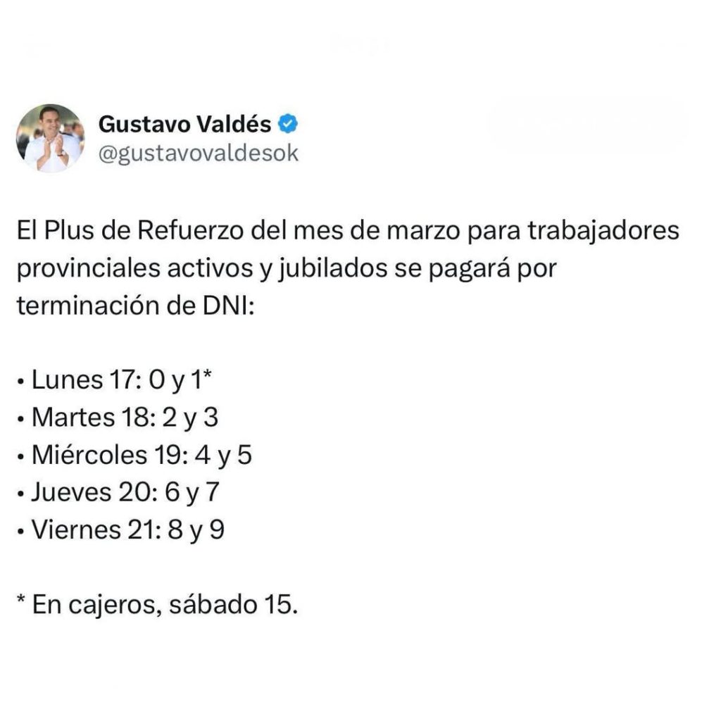 A través de sus redes sociales (@gustavovaldesok) el primer mandatario correntino Gustavo Valdés informó que entre este lunes 17 y el viernes 21, el Gobierno de Corrientes paga el Plus de Refuerzo correspondiente a marzo, de $50 mil pesos por agente. Alcanza a activos, jubilados y pensionados de la administración pública provincial.