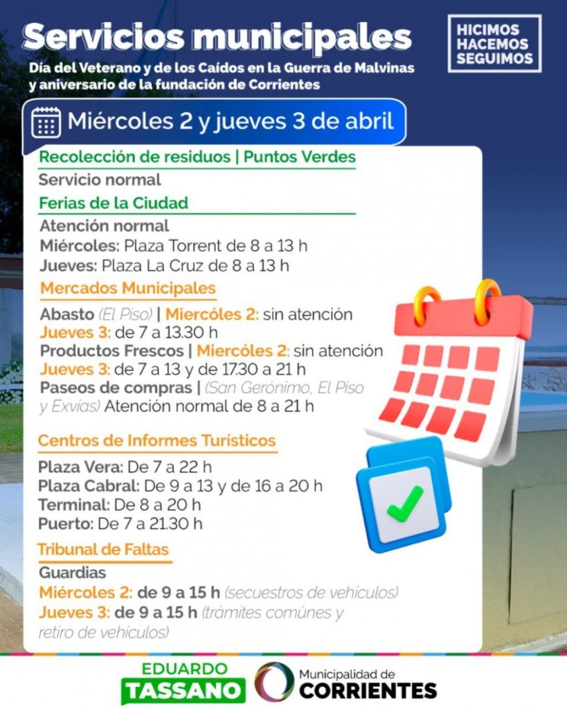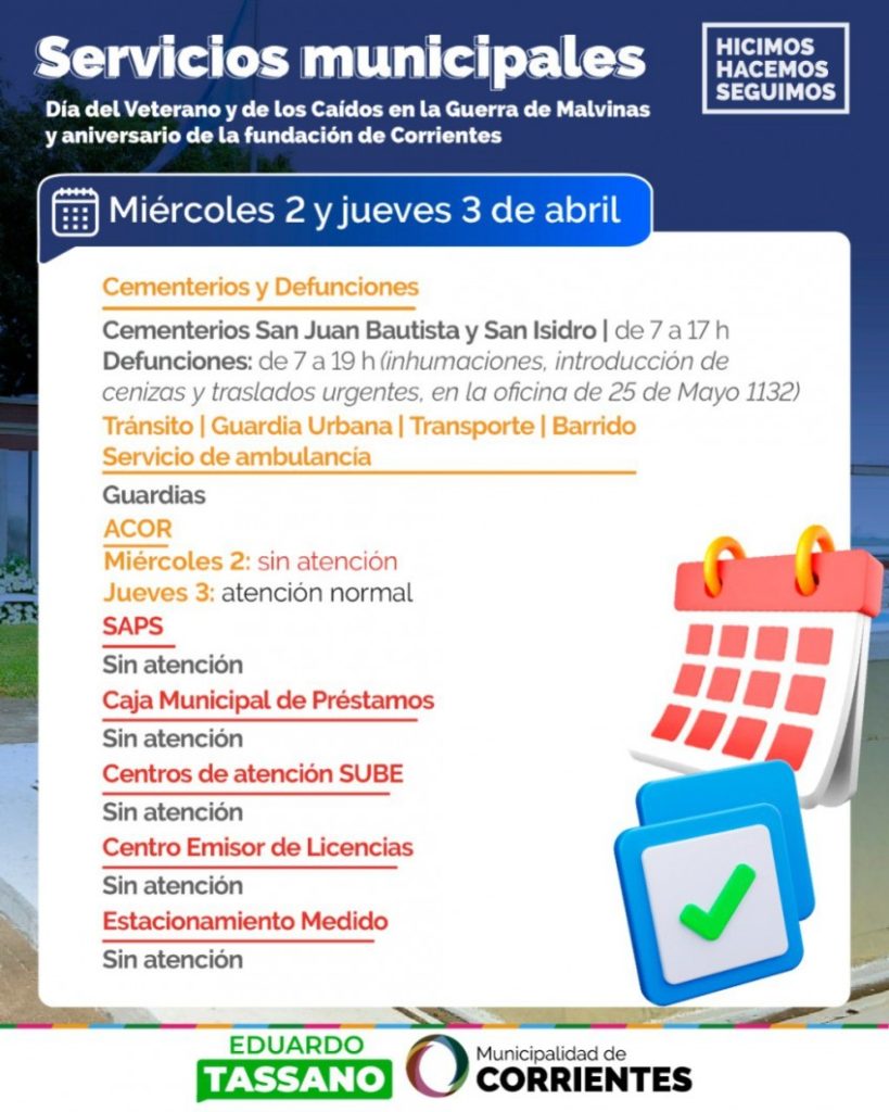 La Municipalidad de Corrientes informa acerca del funcionamiento de sus diferentes áreas para los días miércoles 2 y jueves 3 de abril, fechas en las que habrá feriado nacional y municipal, en conmemoración al Día del Veterano y los Caídos en la Guerra de Malvinas, y el aniversario 437º de la fundación de la Ciudad, respectivamente. Esto último se dispuso a través de la Resolución 1363/25.