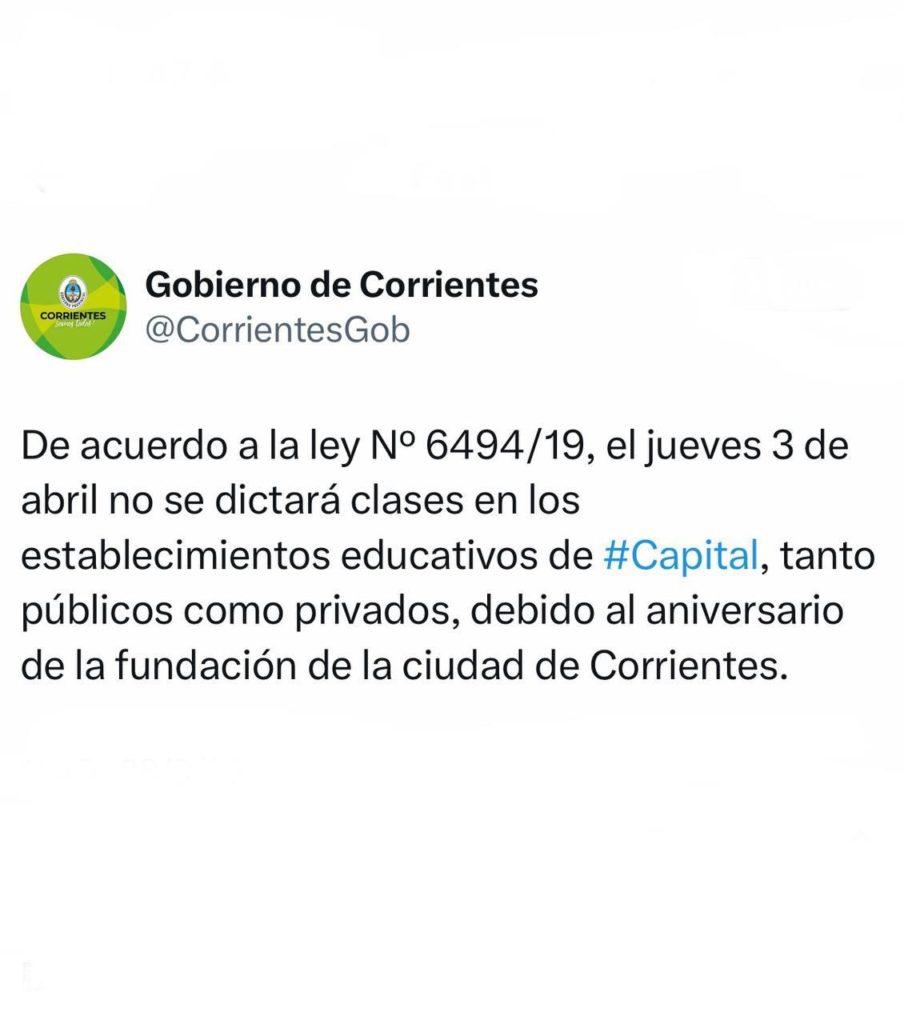 El Gobierno de Corrientes recordó, desde sus redes sociales, que “de acuerdo a la ley Nº 6494/19, el jueves 3 de abril no se dictará clases en los establecimientos educativos de Capital, tanto públicos como privados, debido al aniversario de la fundación de la ciudad de Corrientes”.