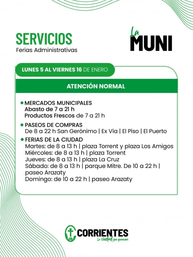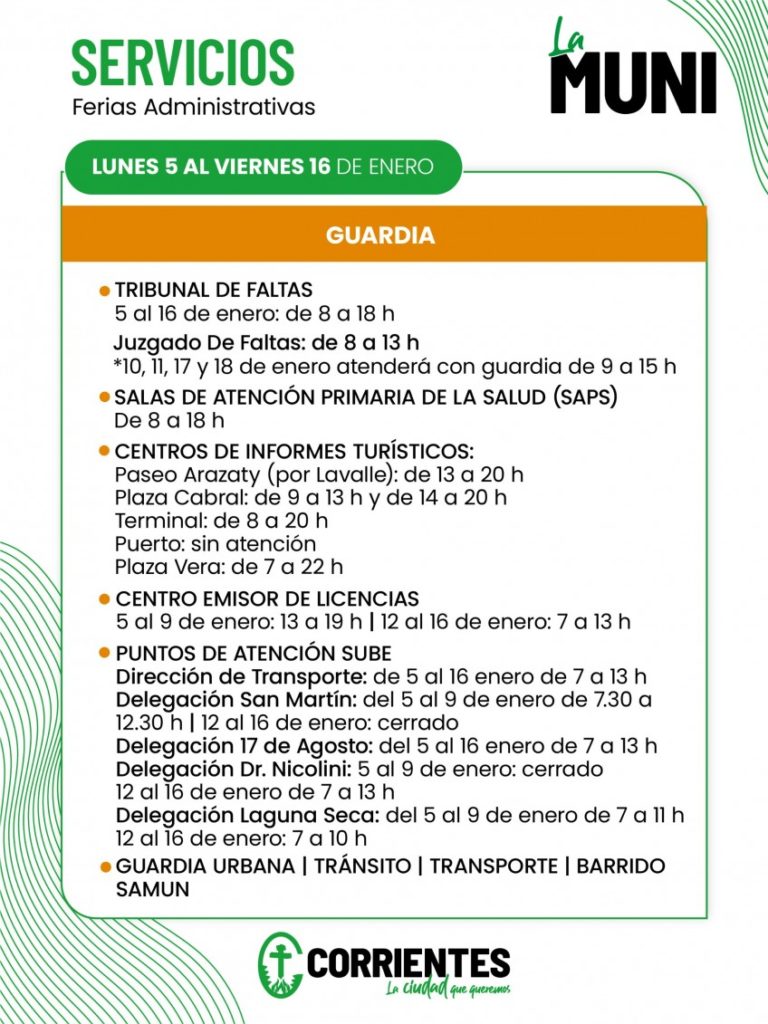La Municipalidad de Corrientes informa el funcionamiento de los servicios que habitualmente brinda, teniendo en cuenta la Feria Administrativa dispuesta para el personal municipal del 5 al 18 de enero próximo, en dos turnos, a través de la Resolución Nº 036 suscripta por el intendente, Claudio Polich.