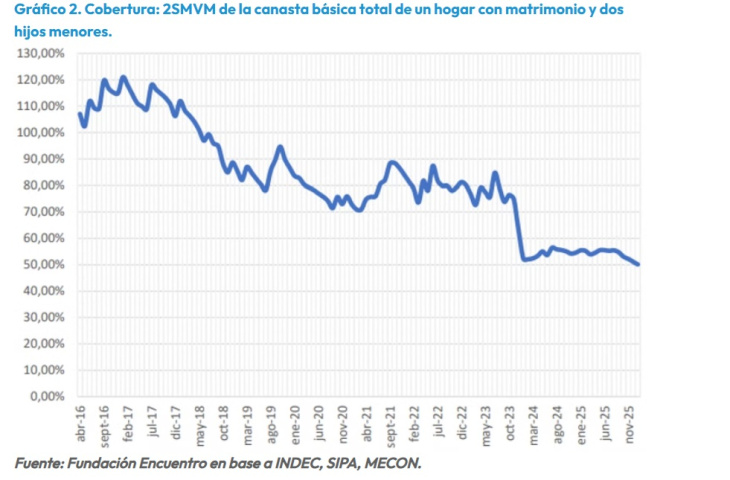 En febrero alcanzó la menor capacidad de cobertura de la canasta básica total para un hogar tipo de cuatro integrantes en toda la serie disponible. Es decir, nunca antes el salario mínimo cubrió tan poco de los bienes y servicios considerados esenciales para no caer bajo la línea de pobreza.
